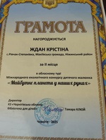 Вітаємо Ждан Крістіну з перемогою в обласному турі Міжнародного екологічного конкурсу дитячого малюнка "Майбутнє планети у наших руках"